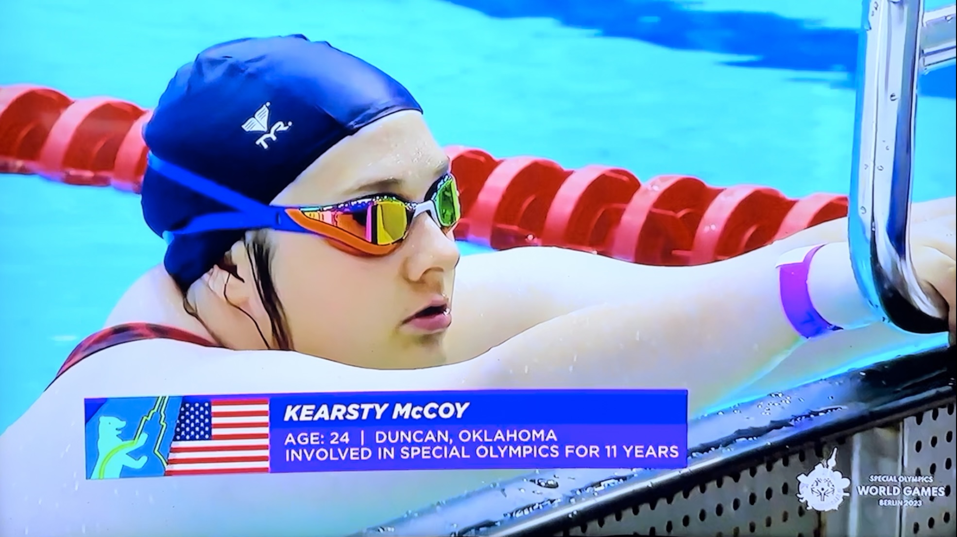 Kearsty McCoy graduated from Duncan, OK in 2017 and has made Duncan her home. She is currently a Special Olympics Swimming Athlete who started participating in Special Olympics in 2012, when she was 13 years old. She lives by her saying, “If I don’t try it will be impossible.” She dreams big and works hard to accomplish anything in her path. She has attended the Special Olympics 2018 USA Games in Seattle, 2022 USA Games in Orlando, and most recently the 2023 World Games in Berlin. While at the 2023 Special Olympics World Games in Berlin, Kearsty received two silver medals. In 2018 she was a co-founder of Specially Made Penguins, a club for individuals with special needs. She continues to mentor the other members of the Penguins to help them gain the confidence to succeed not only in swimming, but in anything they attempt. Kearsty loves her German Shepard, Galaxy, very much. When she isn’t in the pool swimming, she enjoys volunteering as an assistant coach for the Vortex Swim Team, visiting with friends and family and collecting snow globes, especially Disney ones.